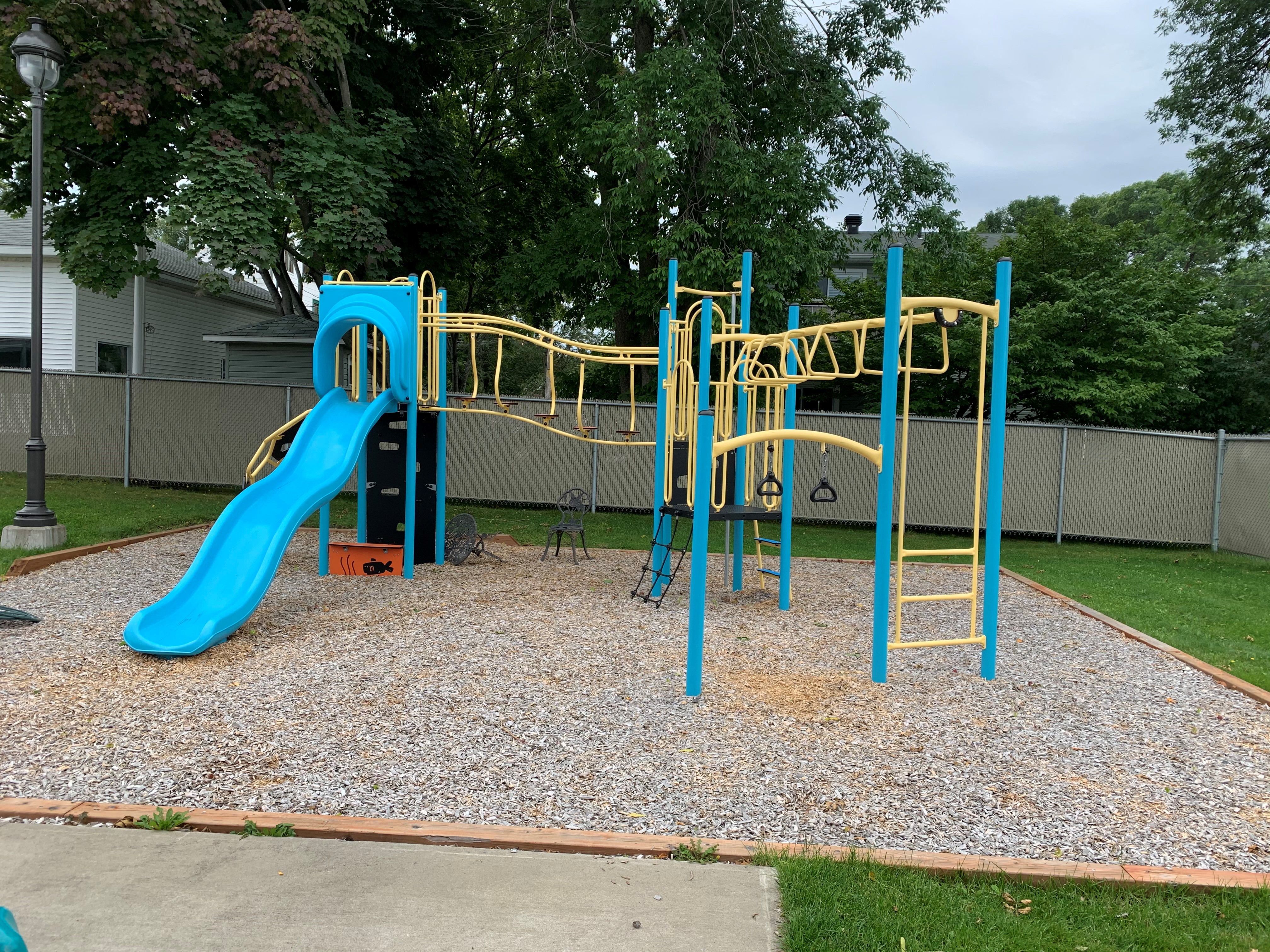 Installation de modules de jeux pour les enfants dans la cour extérieure et aménagement du terrain sous les modules